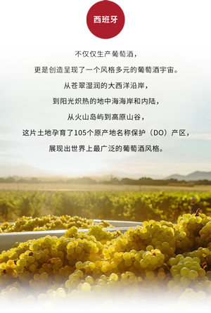 ⻄班⽛的本⼟葡萄品种极为丰富,既有国际知名的丹魄、歌海娜、阿尔巴利诺,也有地区特有的⻔⻄亚、格德约、弗德乔等,它们在不同⽓候与⼟壤条件下表达出迥异⻛格。⻄班⽛的葡萄酒产业同时在有机种植与可持续发展⽅⾯居于全球领先地位,其有机葡萄园⾯积居世界之⾸。
