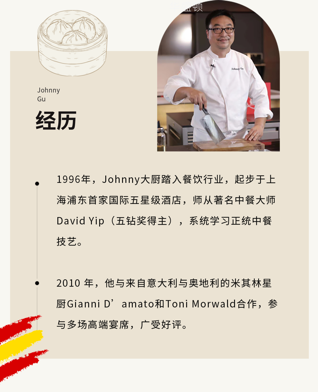 资深中餐主厨,曾担任上海绅公馆(Lilac Family Cuisine)⾏政总厨。他亦是上海总厨联盟创始⾦牌会员,并担任上海⼯商职业技术学院现代服务学院教学总厨。此外,他⻓期从事餐饮品牌顾问与菜单研发,亦是多档美⻝节⽬嘉宾评审。